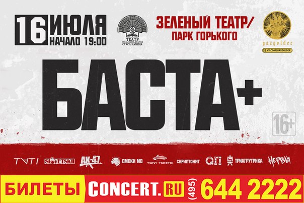 Вначале о традиционном событии: 16 июля, далеко не в первый раз, Баста и компания будут покорять «Зелёный Театр». Вся команда в сборе: Смоки Мо, АК-47, Триагрутрика, Скриптонит, Словетский, Tony Tonite, Тати и группа Нервы. Несмотря на то, что Гуф выступал в 2014 и 2012 году, в этом он, судя по всему, не посетит данное мероприятие.