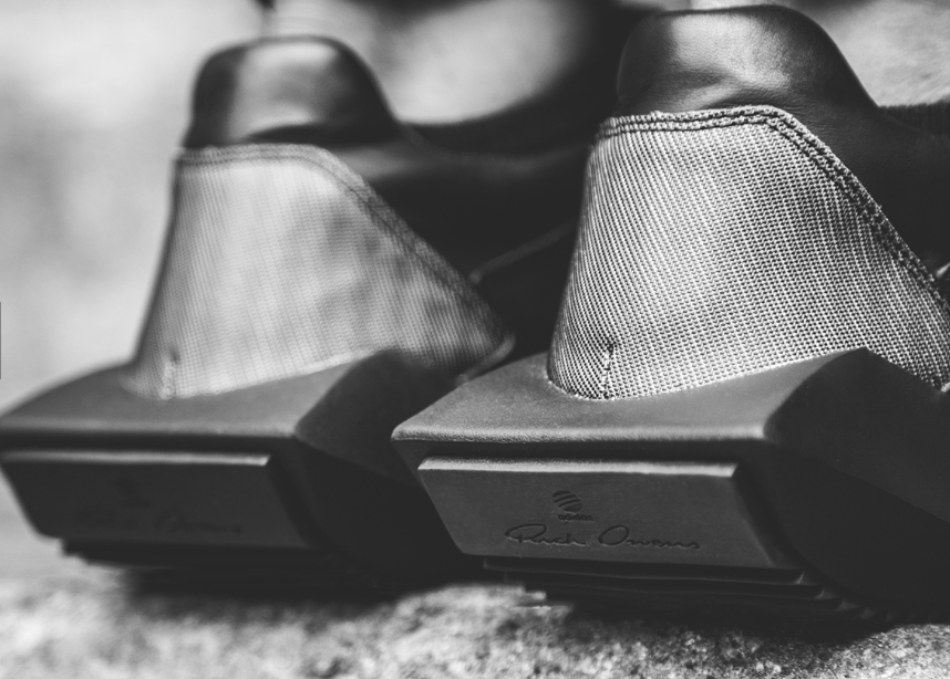 Теперь мы можем рассмотреть кроссовки поближе. Геометрия линий, дорогая кожа, замшевые вставки, игра чёрного с белым; словом, новая модель - нечто большее от Rick Owens, чем от Adidas. Даже три полосы, отличительный признак немецкого спортивного бренда, претерпели качественные изменения, уступив оуэнсевскому минимализму. Получить сиё удовольствие можно за $790.