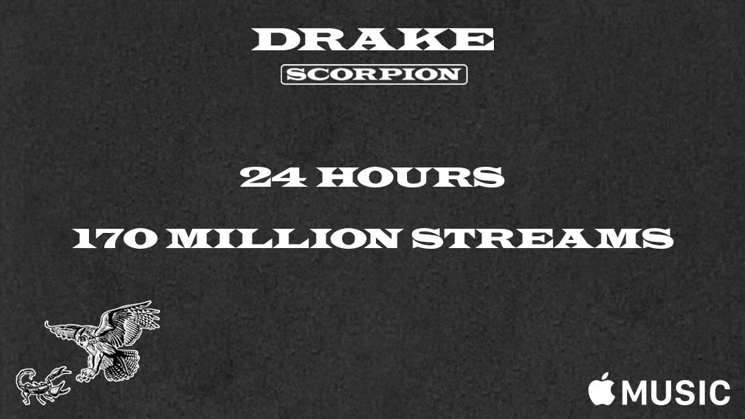 Стриминговые сервисы сообщают о новых рекордах, которые Дрейк установил своим новым альбомом «Scorpion». Так, на Apple Music пластинку прослушали за первые сутки 170 миллионов раз. Это почти в два раза больше предыдущего достижения, которое принадлежало прошлогоднему релизу канадца «More Life» (89,9 миллионов стримов).