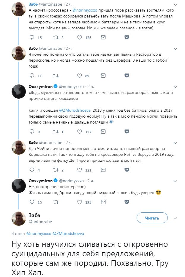 Мирон ответил, что Забэ — «Недостаточно важный курица, чтоб я с тобой, как с Гнойным, за год забивался». Кроссовера двух баттл-лиг пока что не будет, и баттлов от Оксимирона в 2018-м ждать тоже не нужно.