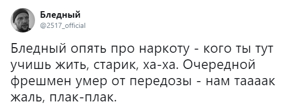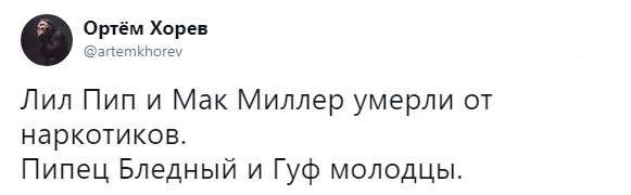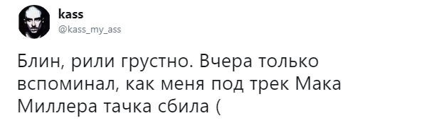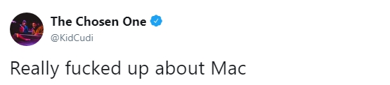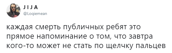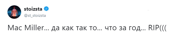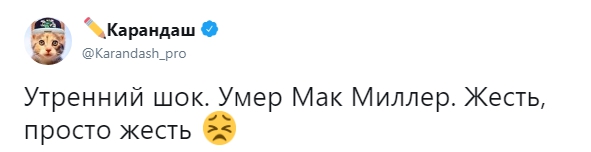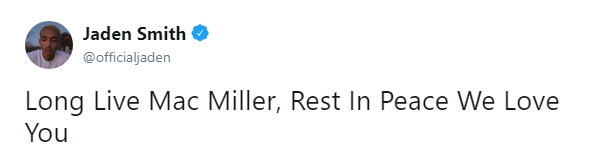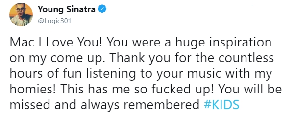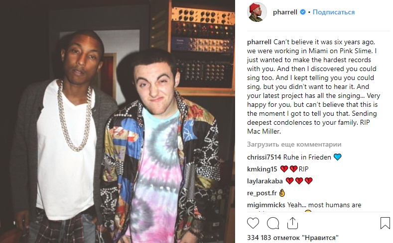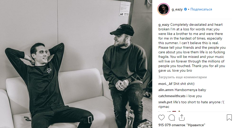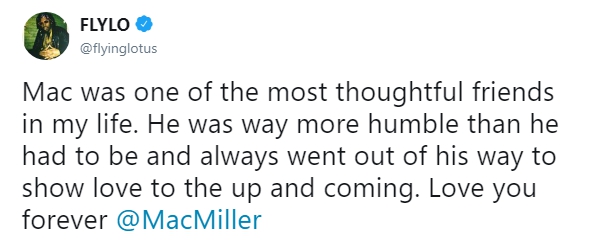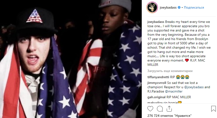 Мое сердце разбивается каждый раз, когда мы теряем людей... Я всегда буду благодарен тебе, бро. Ты поддерживал меня и выражал уважение с самого начала. Благодаря тебе 17-летней парень и его друзья из Бруклина выступали перед 5-тысячной аудиторией после школы. Это изменило мою жизнь. Жаль, что нам не удалось больше пообщаться и записать новую музыку... Жизнь слишком коротка, цените каждый ее момент. R.I.P. Мак Миллер