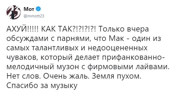 Мы разговаривали меньше двух недель назад. Что за херня, чувак. От этого мне так грустно. RIP Мак!