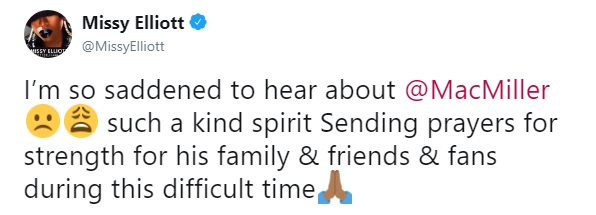 Я так опечалена слышать о смерти Мак Миллера. Он был таким добродушным. Молюсь за его семью, друзей и фанатов в это трудное время.
