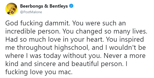 Я полностью опустошен и разбит. У меня нет слов, Мак, ты был мне, как брат, и был рядом со мной в самые трудные моменты, особенно этим летом. Не могу поверить, что это правда. Пожалуйста, скажите своим друзьям и людям, о которых вы заботитесь, что вы любите их. Жизнь очень хрупка. Нам будет тебя не хватать, а твоя музыка будет жить вечно через миллионы людей, чьи сердца ты тронул. Спасибо за все, что дал нам. Люблю тебя, бро.