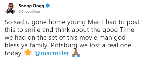 Мне так грустно от того, что ты ушел домой, Мак. Я должен был запостить это, чтобы улыбнуться и подумать о том, как мы здорово провели время на съемках. Да благословит Бог твою семью. Питтсбург, сегодня мы потеряли настоящего артиста.