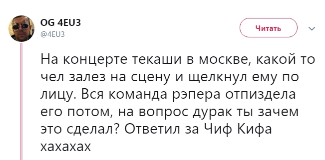 Также стала известная гениальная причина нападения. По словам зачинщика, он хотел «ответить за Чиф Кифа». Об этом сообщает 4eu3, который был на концерте.
