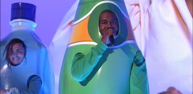 Так, сначала Йе и Lil Pump переоделись в костюмы бутылок воды Perrier и Fiji, чтобы исполнить свой вирусный хит «I Love It». Отдельное удовольствие — наблюдать за тем, как артисты пытаются исполнить на ТВ песню, наполовину состоящую из производных слова «Fuck».
