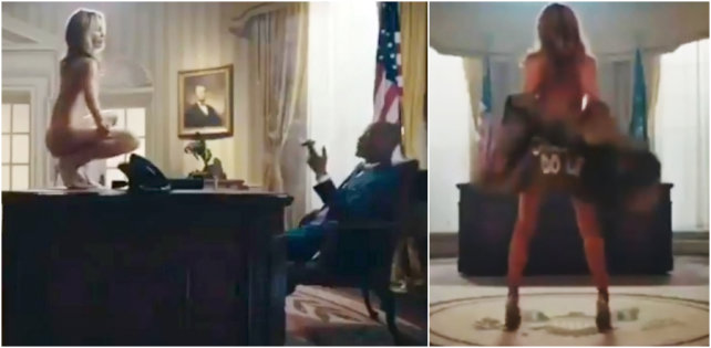 В нем он восседает в Овальном кабинете и смотрит, как девушка, изображающая Меланию Трамп, танцует для него стриптиз. Все это выглядит весьма откровенно, особенно когда фальшивая Первая леди запрыгивает на стол в обнаженном виде, а затем разрисовывает красным глаза на портрете Трампа.