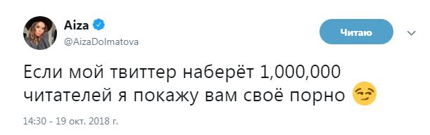 Сегодня Айза Анохина (ex-Долматова) заявила в твиттере, что если она наберёт в этой соцсети миллион подписчиков, то покажет порно со своим участием.