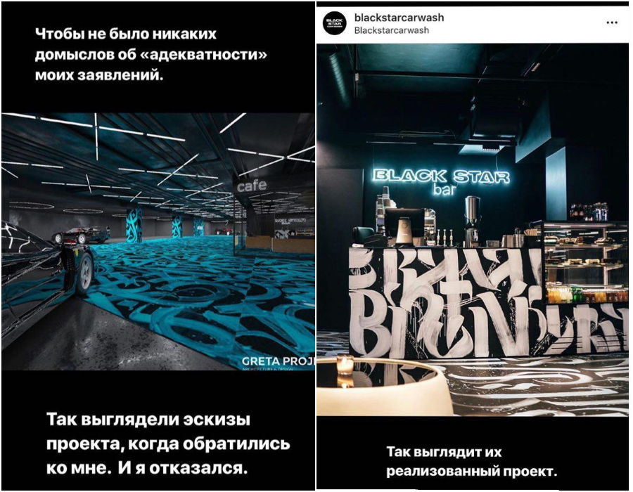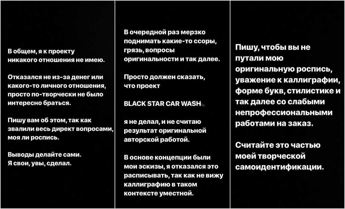 Однако сам художник решил детально рассказать о сложившейся ситуации у себя в инстаграм-сторис. По его словам, в основе концепции проекта лежали его эскизы, но он отказался принимать участии в росписи помещения, поскольку не видит «каллиграфию в таком контексте уместной».
