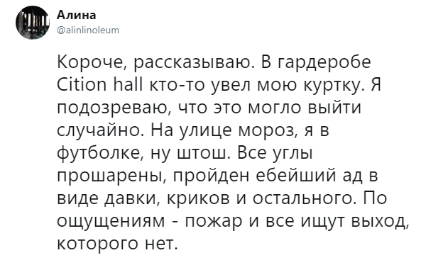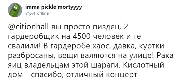Всем и каждому, кто попал в замес после концерта в Cition Hall — мы приложили все силы к решению этой ситуации, но вина за хаос в гардеробе полностью лежит на площадке. В ближайшее время администрация Cition Hall объявит вам о порядке действий в случае утери или порчи ваших вещей.