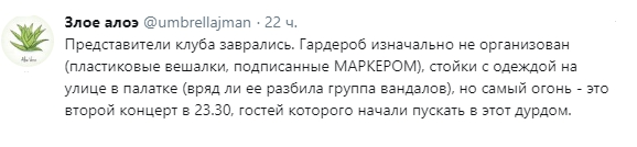 Клуб оказался не готов к такому наплыву гостей и не справился с задачей сохранности и выдачи одежды. Гардероб был захвачен публикой,охрана смята.Часть гостей осталась без одежды. pic.twitter.com/BOngzhdKb1
