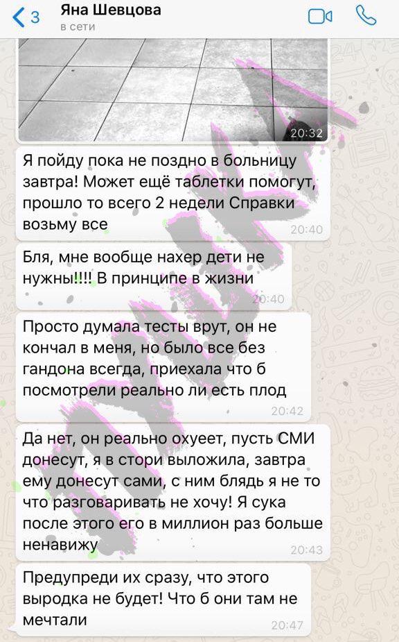 Вчера всё в том же телеграм-канале появилось два сообщения. Первое — скрин сообщений от Яны, из которого становится понятно, что девушка утверждает, будто беременна: