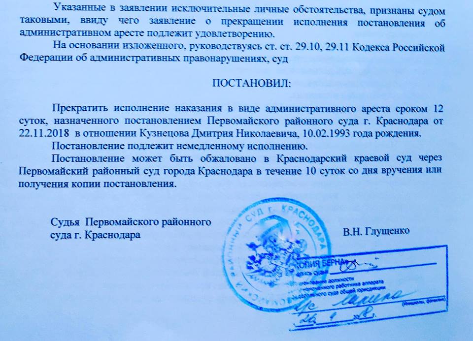 Суд только что удовлетворил заявление защитников репера Хаски (Диитрия Кузнецова) и прекратил исполнение наказания в виде административного ареста на 12 суток. Постановление подлежит немедленному исполнению. Едем в спецприемник за Дмитрием.