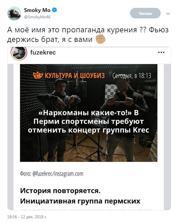 Сегодня Фьюз выложил в инстаграме скрин с сайта v-kurse.ru — в статье, вышедшей на этом ресурсе, рассказывается, как пермские «общественники» хотят сорвать концерт Krec, который должен пройти 16 декабря в пермском клубе М5.