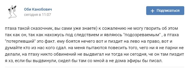 Ночью же сам Оби в своём паблике в ВК и на личной странице утверждал, что сдал как раз всех Птаха, аргументируя — мол, я подозреваемый, а Птаха потерпевший, вот и думайте сами.