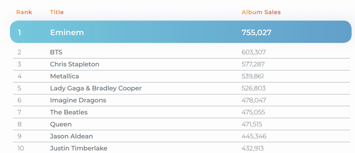Что касается продаж, то Eminem занял первое место по количеству проданных альбомов с результатом в 755 027 копий. Важно отметить, что в данном случае речь идет именно об общем количестве традиционных продаж — без учета стриминга. Причем, в случае с Эминемом на альбом «Kamikaze» пришлась примерно половина всех продаж, а вот остальная часть распределилась между предыдущими пластинками Маршалла.