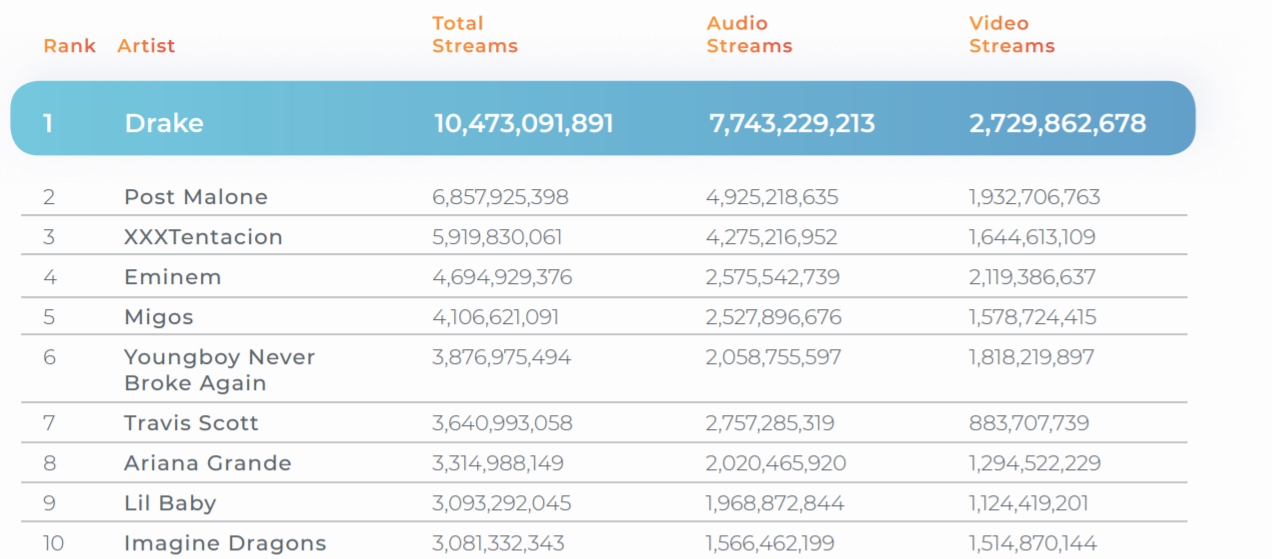 Зато в стриминговом чарте канадский хитмейкер уверенно занимает первое место с феноменальными 10 миллиардами прослушиваний. Eminem пусть и существенно отстает, но уверенно занимает четвертую строчку с 4,6 миллиардами стримов.