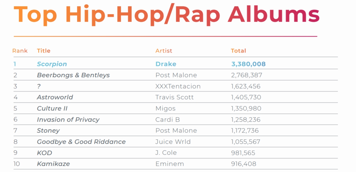 А вот так выглядит десятка самых успешных рэп-альбомов 2018 года. Они высчитываются по схожей формуле, которая используется, например, в чартах Billboard: Общие продажи = Проданные копии альбомов + (Проданные песни/10) + (Количество стримов/1500).