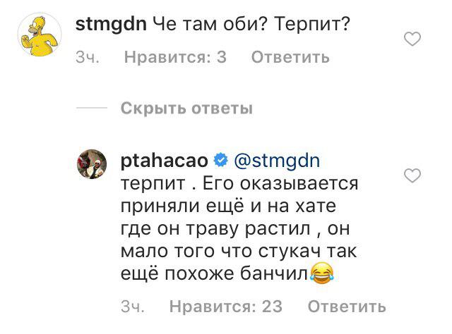 Птаха, отвечая на вопросы читателей в инстаграме, сообщил новые подробности о судьбе своего врага Obe 1 Kanobe. Если сведения Давида достоверны, то Оби не позавидуешь. Птаха поведал, что его оппонента «приняли на хате, где он траву растил».