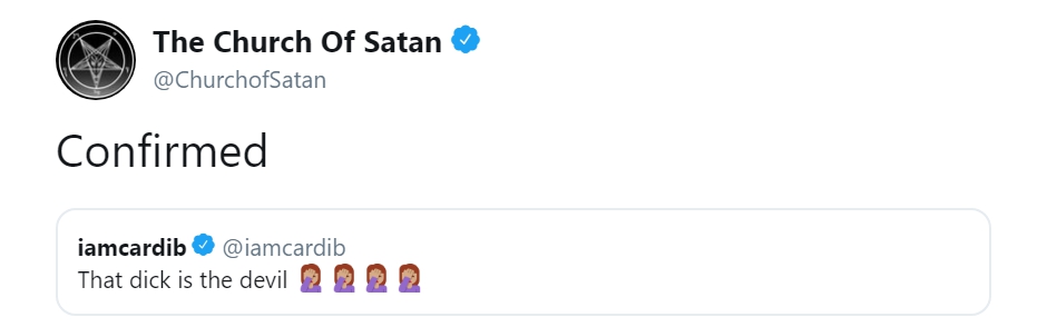 Буквально через пару часов на сообщение отреагировал официальный аккаунт церкви Сатаны. Ответ был весьма коротким: «Подтверждено». Такой юмор, разумеется, оценили не все, однако провокация сработала, и люди принялись обсуждать фразу Карди с еще большим энтузиазмом.