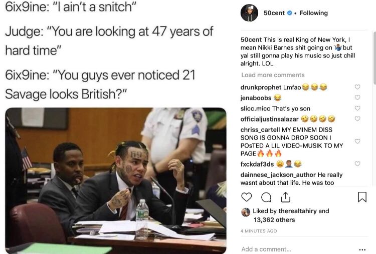50 Cent в шутку намекнул, что 6ix9ine сдал 21 Savage, но тут же удалил пост