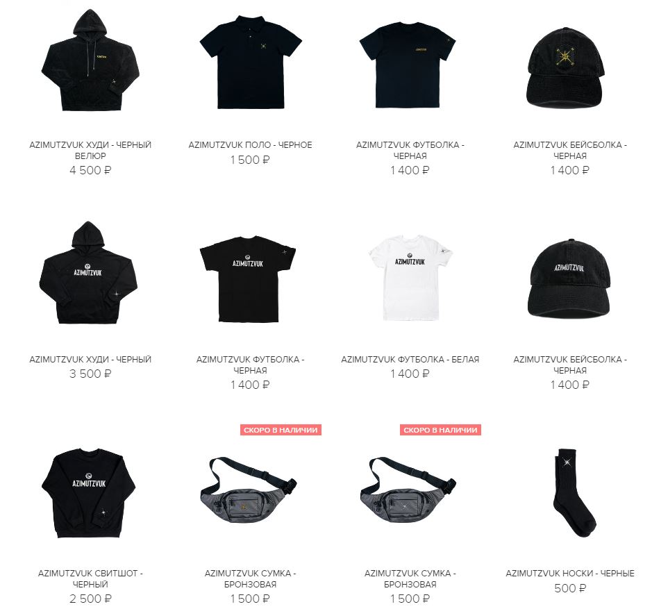 Все вещи в магазине — с логотипом лейбла Слима «Azimut Music». Ассортимент довольно предсказуемый (возможно, носки — не самый ожидаемый товар, но, думаем, он будет пользоваться спросом): худи, поло, футболки, бейсболки, свитшоты, сумки и носки.