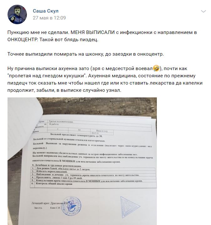 Саша уже лежал в инфекционном отделении, откуда его выписали с направлением в онкоцентр.