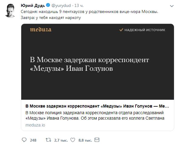 6 июня в Москве был задержан корреспондент «Медузы» Иван Голунов. Силовики обвиняют его производстве и сбыте наркотиков. Голунов, которого при задержании избили, не дали вызвать адвоката и отказались взять его ногти на анализ, всё отрицает.