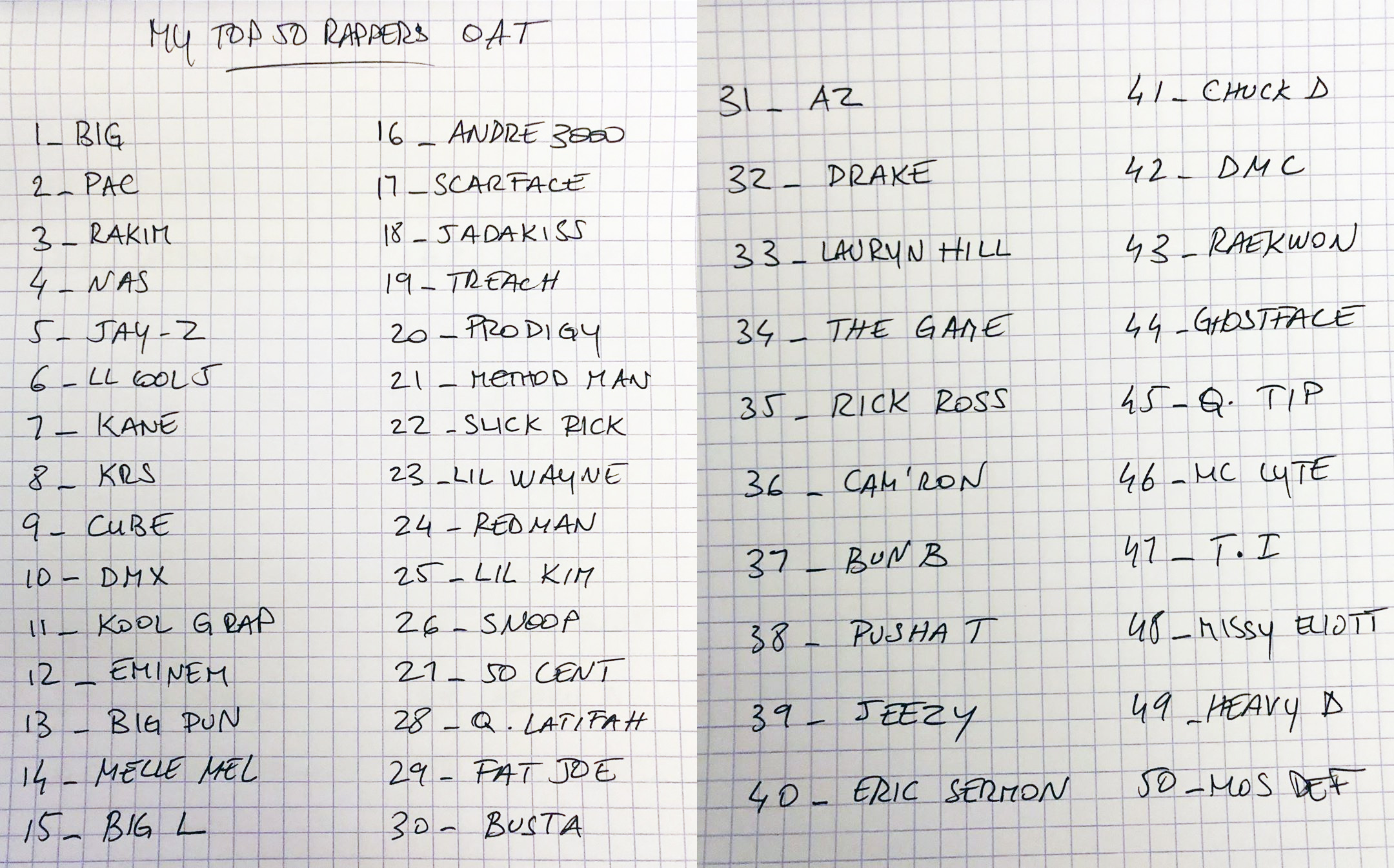 Сегодня Майк Тайсон опубликовал в своем инстаграме две фотографии, на которых от руки написан список из 50 (по его мнению) лучших рэперов всех времен.