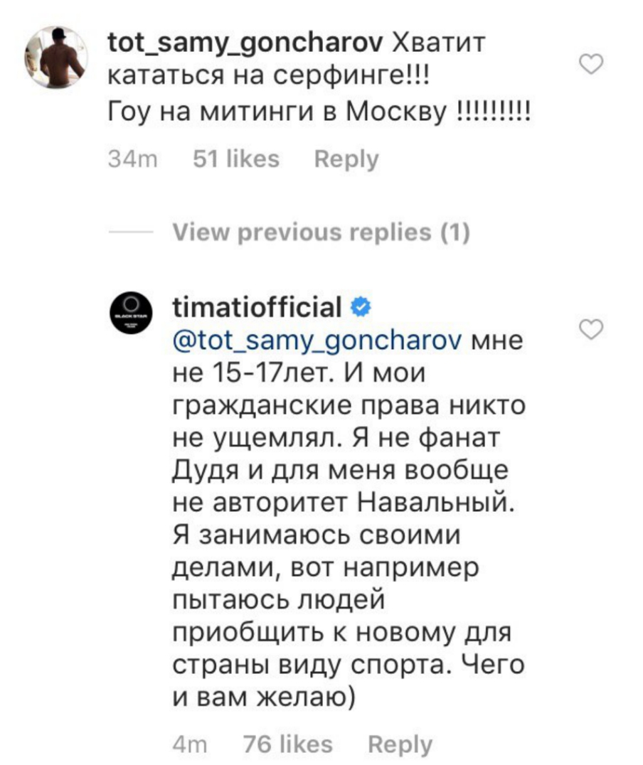 Так, один из пользователей инстаграма призвал Тимати перестать кататься на серфе и выйти на улицы, на что получил следующий ответ: