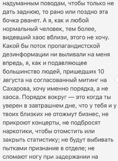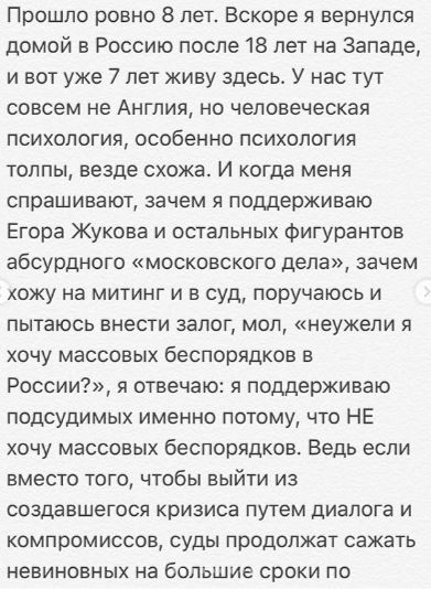 Сегодня Оксимирон написал большой пост, в котором рассказал, почему вышел на согласованный митинг, что делал в судах, и почему его позиция направлена как раз-таки против массовых беспорядков. Также Мирон вспомнил о беспорядках в Англии, которые он сам наблюдал своими глазами 8 лет назад.