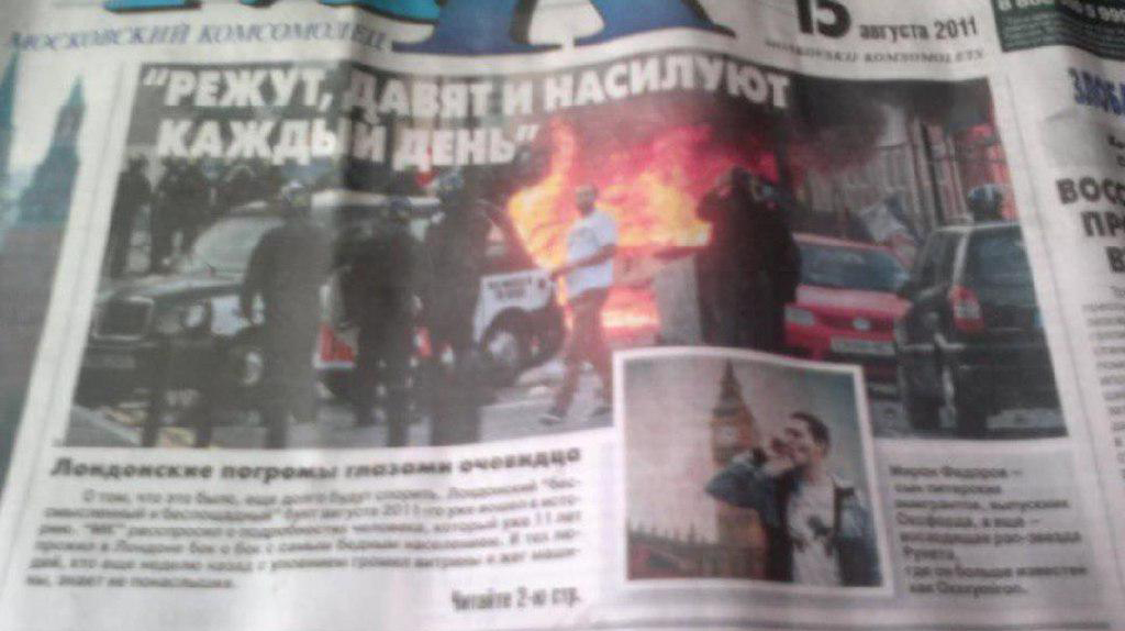 На второй день погромов я как раз пригнал в Кройдон записать на домашней студии у @jahnasebastian трек «Russky Cockney». Улицы выглядели, как зона военных действий, в небе кружили вертолеты, по улицам шатались группы людей в масках и капюшонах. Было стрёмно и совершенно не круто. Я вел трансляцию о происходящем в твиттер, чем и привлек внимание журналистов, пытавшихся разобраться в происходящем. Официальной причиной погромов российские СМИ тогда называли волнения на расовой почве, что крайне слабо соответствовало реальности. Скорее они были спонтанным выплеском накопившихся в беднейших слоях общества проблем, которые британские власти не хотели решать. Ну а непосредственным поводом послужило убийство полицейскими некого уличного, но, судя по всему, безоружного джентельмена на Тоттенхэме, точнее, их нежелание признать ряд ошибок в этом деле и назвать виновных.