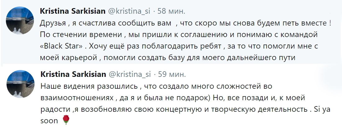 Исполнительница пишет о том, что ей удалось прийти к понимаю с Black Star, и заодно благодарит лейбл за помощь с развитием ее карьеры. Таким образом, теперь Кристина вновь сможет использовать свой псевдоним и выступать с концертами.