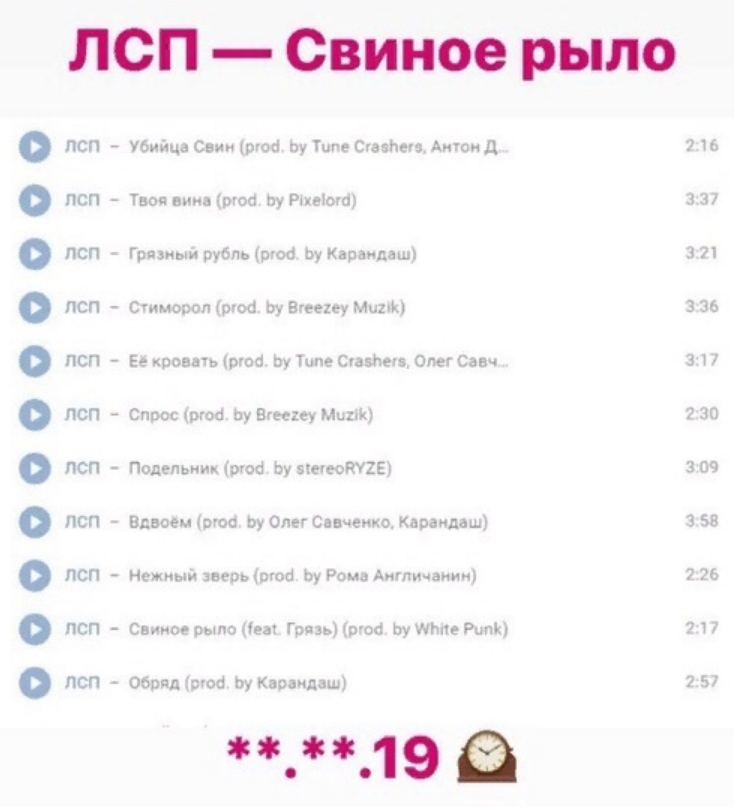 Вчера в инста-сторис ЛСП появился скриншот предположительного треклиста нового альбома белорусской группы. Пластинка получит название «Свиное рыло» и выйдет до конца этого года.