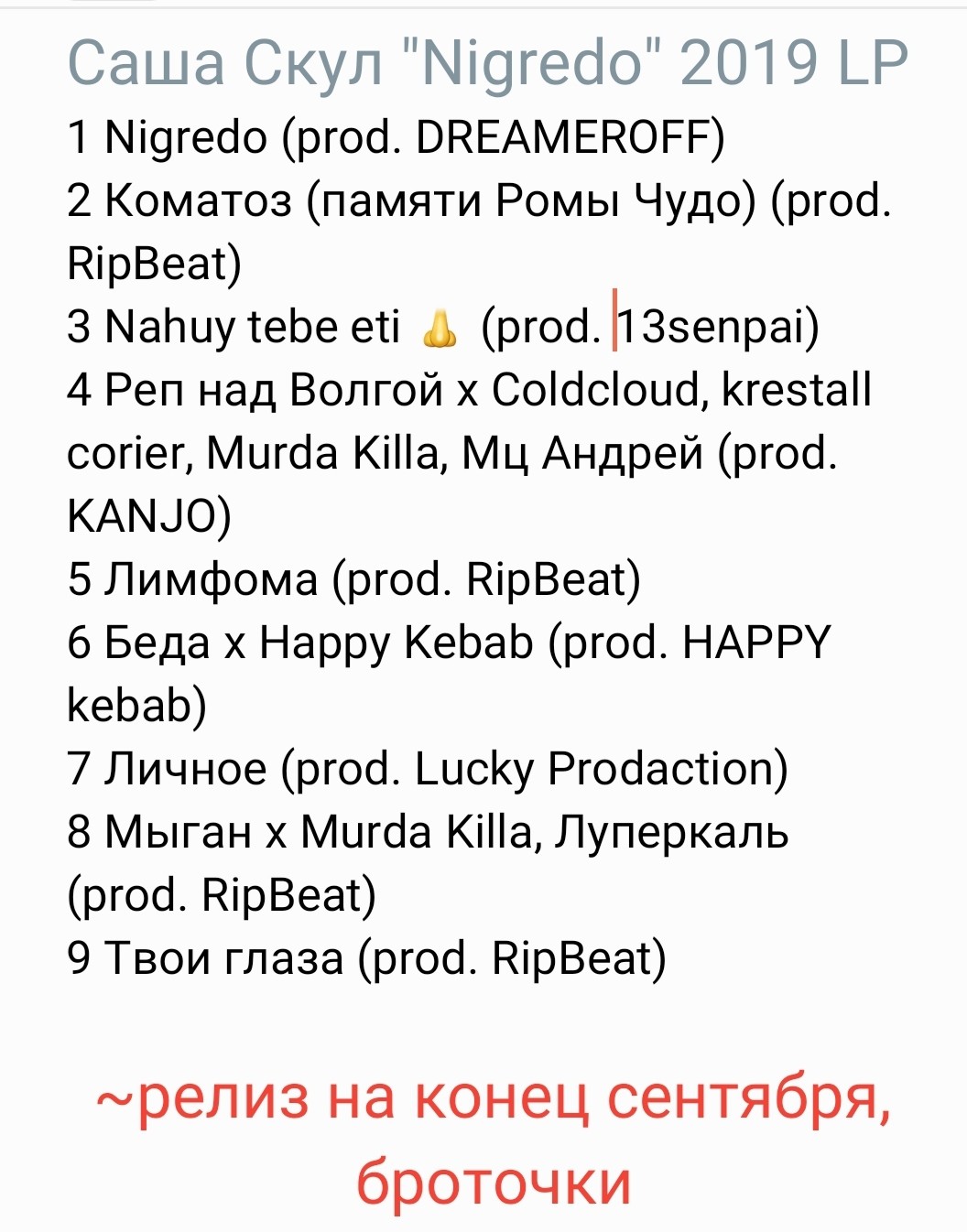 «Буду жить, к концу сентября выйдет», — пишет Скул.
