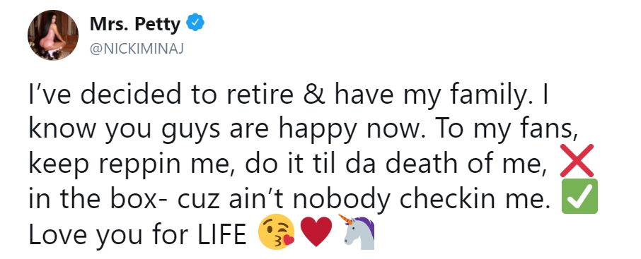 Nicki Minaj обратилась к поклонникам в твиттере и заявила о завершении своей рэп-карьеры. «Я решила закончить карьеру и завести свою семью», — сообщила исполнительница, заодно поблагодарив слушателей за поддержку.