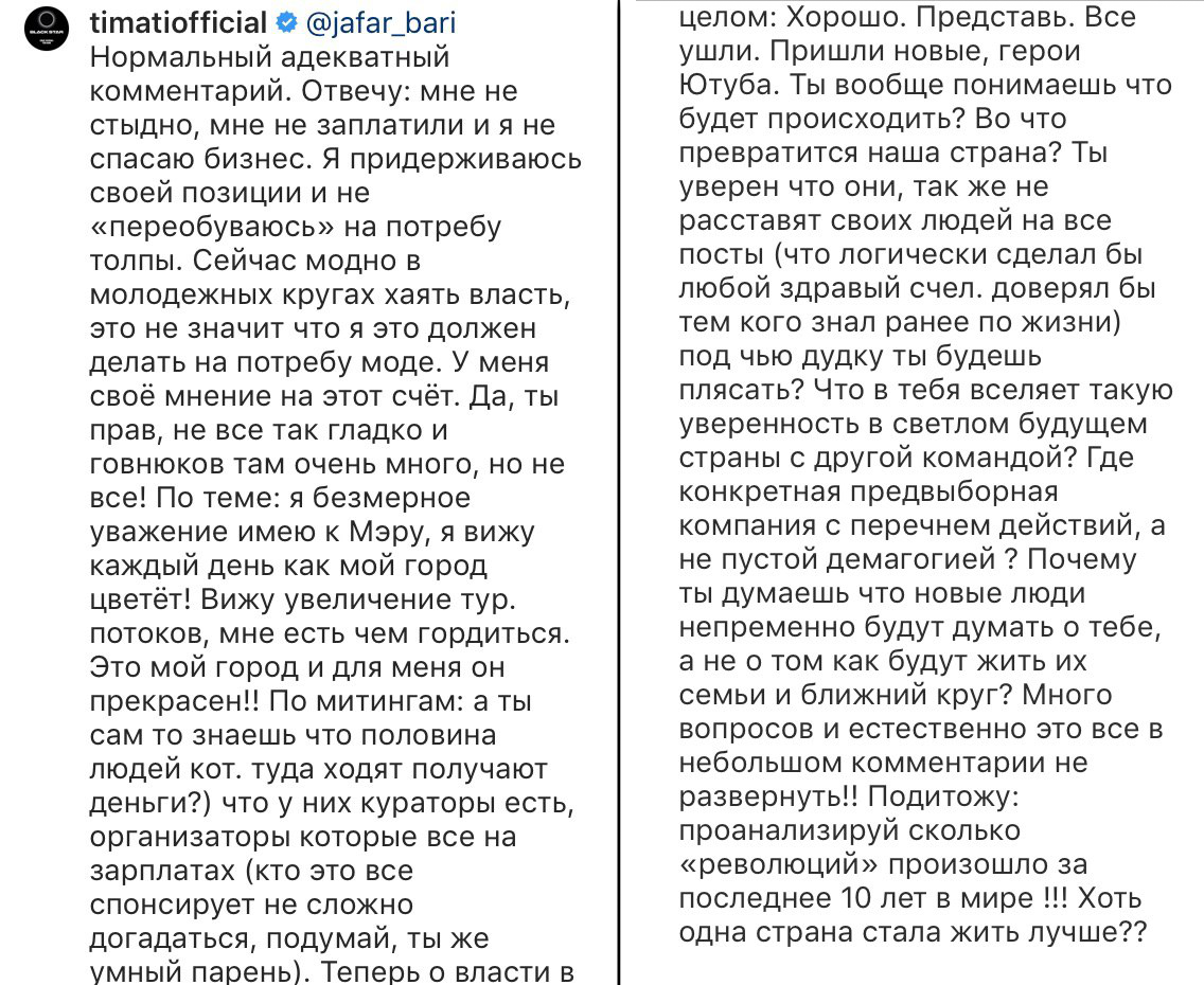 Теперь к хейтерам обратился Тимати — в комментариях в инстаграме он заявил, что ему не стыдно, что он не продавался, и что ругать власть может каждый и что Москва про Собянине изменилась в позитивную сторону.