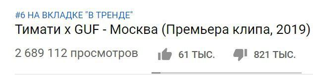 Новое видео лидера Black Star и Гуфа на трек «Москва», вышедшее ко Дню города, стало рекордсменом по количеству дизлайков в российском YouTube — на момент написания новости оно набрало 821 0000 «пальцев вниз», и есть ощущение, что это еще не конец. Лайков же у клипа Тимати и Гуфа куда меньше — всего 61 000.