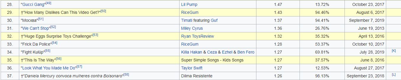 Клипу «Москва» наставили почти полтора миллиона дизлайков — таким образом видео вошло в топ-30 клипов с самым большим количеством негативных реакций.