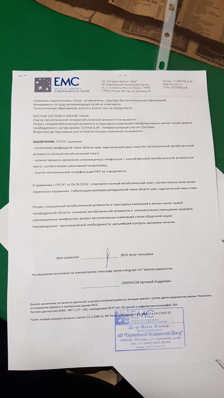 В ожидании результатов на стену уже просто лез, приехал в клинику, дали резы на одном листе, сердце заколотилось, я понимал умом, что коли листо один, значит и описывать нечего было, значит походу все. Прочитал заключение. сел тут же и заплакал слезами счастья.Впереди еще одно вливание, возможно трансплантация, но уже п***й. На данный момент во мне нет рака. Лимфомная история подходит к концу и походу счастливому. Потом пара месяцев реабилитации и я наконец вернусь в жизнь обыденную полностью. Конечно будет страх рецедива, будут обследования, но сейчас плевать, сейчас внутри меня нет этой зл****ей болезни.
