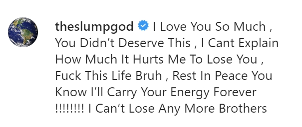 Ski Mask The Slump God: «Я очень тебя люблю, ты не заслужил этого. Не могу объяснить, как мне больно после утраты. На хер эту жизнь, бро, покойся с миром. Ты знаешь, что я буду нести твою энергию вечно!!! Я больше не могу терять братьев»