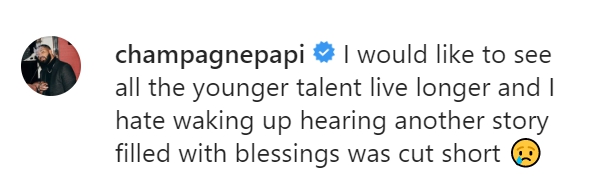 Drake «Я бы хотел, чтобы все молодые таланты жили дольше, и я ненавижу просыпаться и видеть, как еще одна история, наполненная благословениями, обрывается»