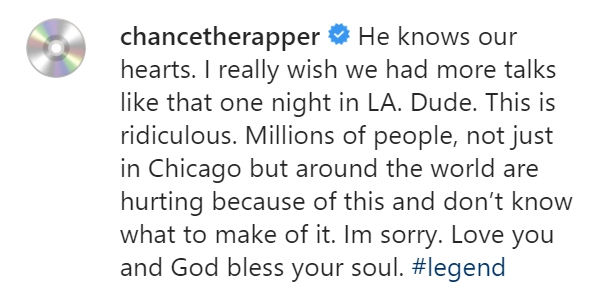Chance The Rapper: «Миллионы людей не только в Чикаго, но и по всему миру испытывают боль из-за этого и не знают, как справится с этим. Мне жаль. Я люблю тебя, и благословит Господь твою душу»