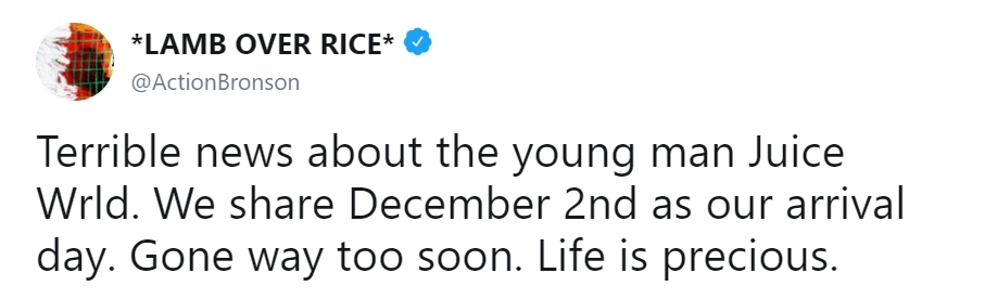 Action Bronson: «Ужасные новости о молодом парне Juice WRLD. У нас обоих день рождения 2 декабря. Ты ушел слишком рано. Нужно ценить жизнь»