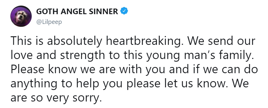 Твиттер Lil Peep: «Это просто душераздирающе. Мы посылаем нашу любовь и силу семье этого молодого человека. Пожалуйста, знайте, что мы с вами и если мы можем как-то помочь вам, пожалуйста, дайте нам знать. Нам очень жаль»