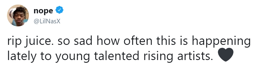 Lil Nas X: «Покойся с миром, Juice. Печально, насколько часто в последнее время это происходит с молодыми талантливыми артистами»