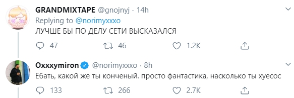 Вместо традиционного игнора в этот раз Окси резко отреагировал на слова Гнойного. «Какой же ты конченный. Просто фантастика, насколько ты х**сос», — написал он в ответ.