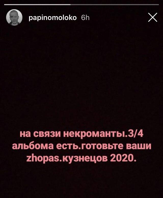 Сегодня Хаски обратился к слушателям в инста-сторис. В сообщении говорится, что 3/4 его нового альбома уже готово. «На связи некроманты. 3/4 альбома есть. Готовьте ваши zhopas. Кузнецов 2020», — коротко и по делу.
