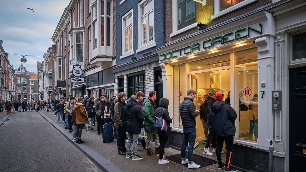 А вот в Голландии (точнее, Нидерландах) немного другая ситуация. Там люди выстроились в очередь возле кофешопа, где можно купить марихуану.
